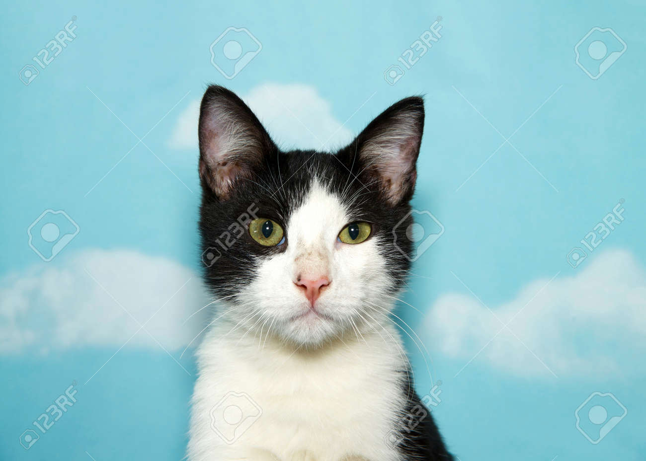 Portrait Of A Black And White Tabby Kitten Looking At Viewer One Eye Partially Squinting And Smaller Than The Other Blue Background Sky With Clouds Copy Space Stock Photo Picture And Royalty